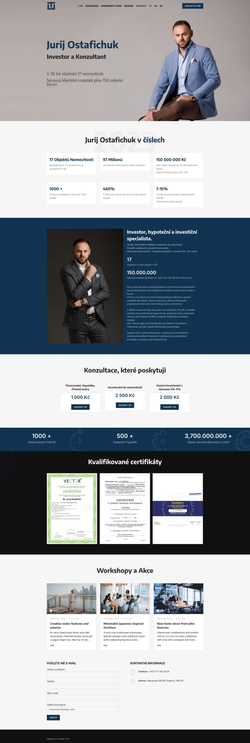 Создание сайта для финансового консультанта и инвестора Юрия Остафичука — эксперта с опытом в сфере недвижимости и управления инвестиционными активами. Основной задачей стало создание многостраничного сайта с презентацией услуг, персональной статистикой, блоками доверия и возможностью оставить заявку онлайн. Важным акцентом выступила необходимость мультиязычного интерфейса (CZ, UA, RU) и соответствие стилю профессиональной сферы.